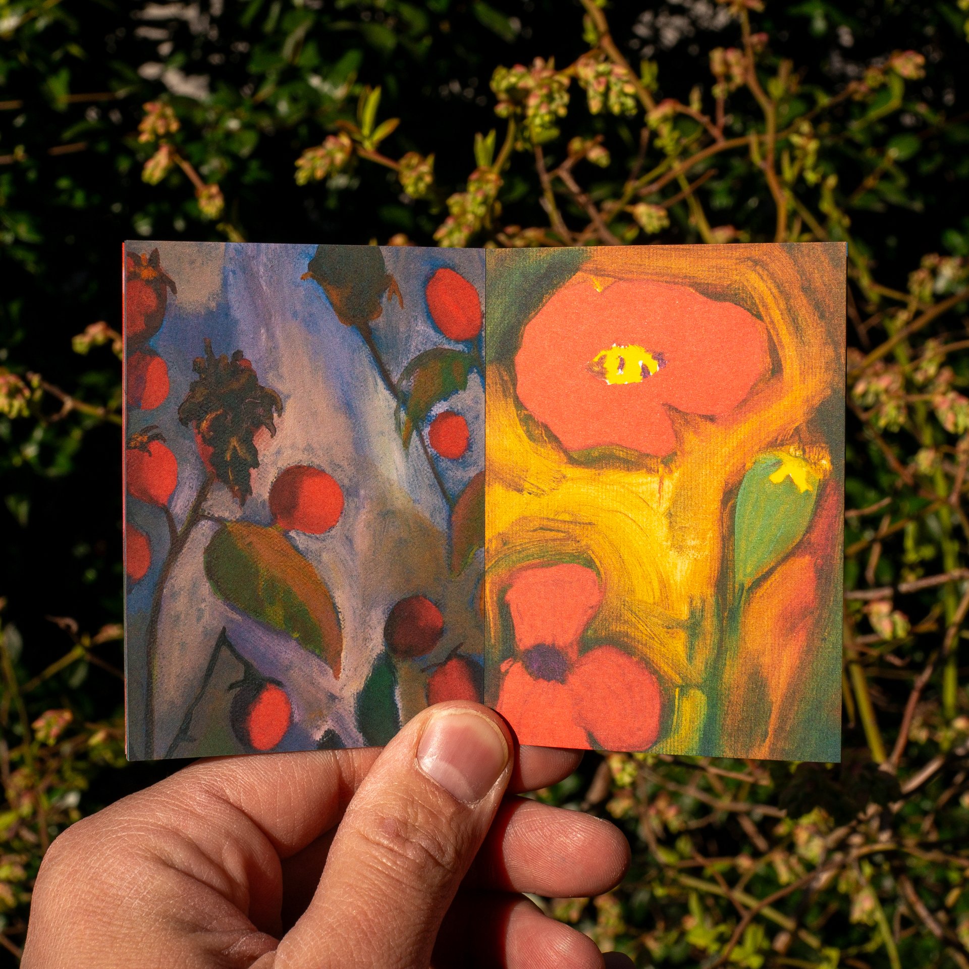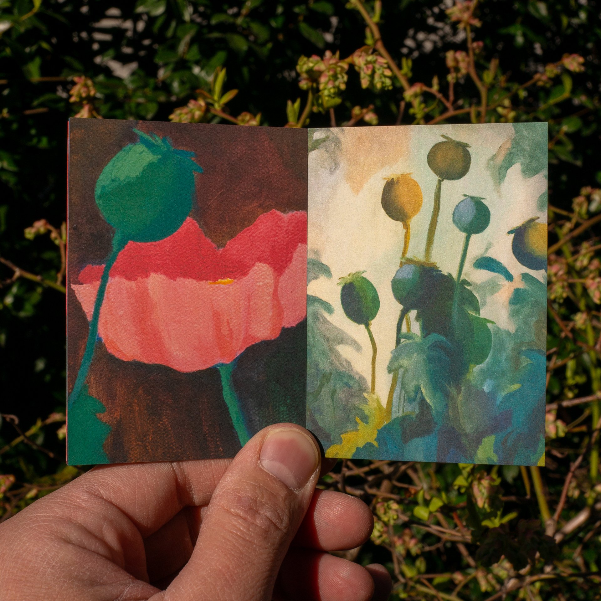 “The human inability to notice plants in one's everyday life is known as plant blindness. When we do notice nature, we often ignore plants that don’t vie for our attention. I am attempting to recapture a moment of awakening and reconnection to these plants. I focus on the moments when familiar plants can appear alien, like quavering poppy pods, or surprising, as with pale petals reflecting moonlight in darkness. The works depicted in this book are all small enough that I could hold them in my hands while painting. I want to invite an act of intimacy into my painting: sometimes by shrinking, you can see the larger world more clearly.”